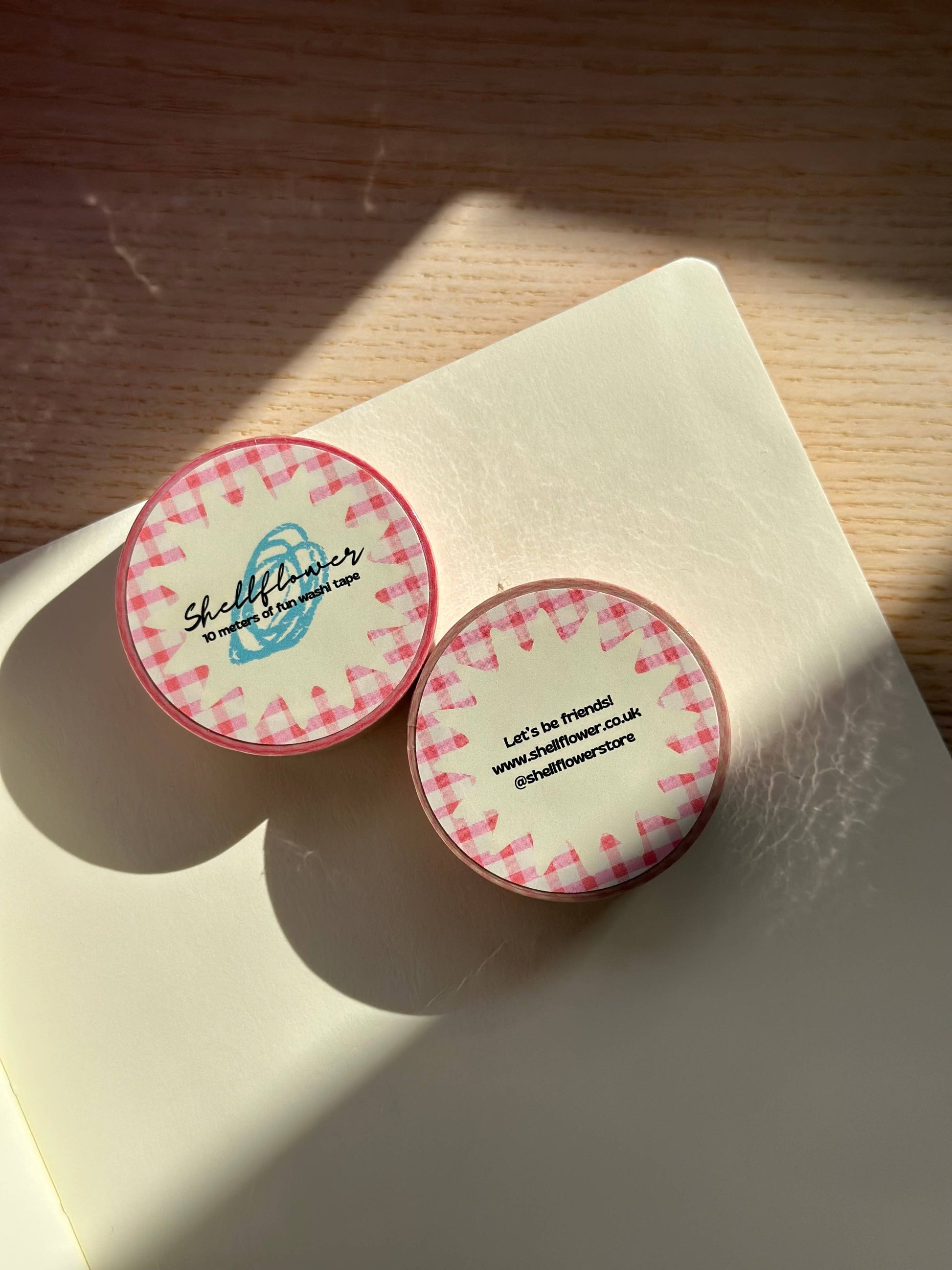 High quality gingham tomato washi tape. 10 metres of super cute, pink check paper tape with repeating tomato and bow design.